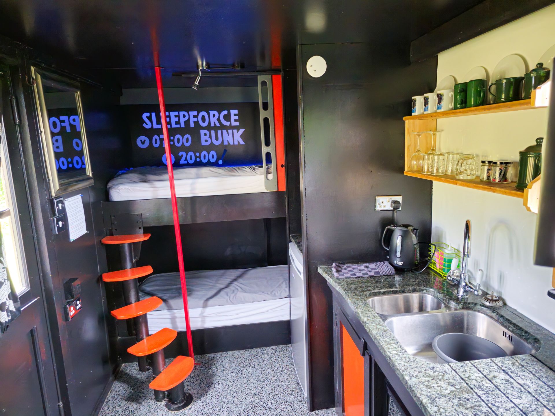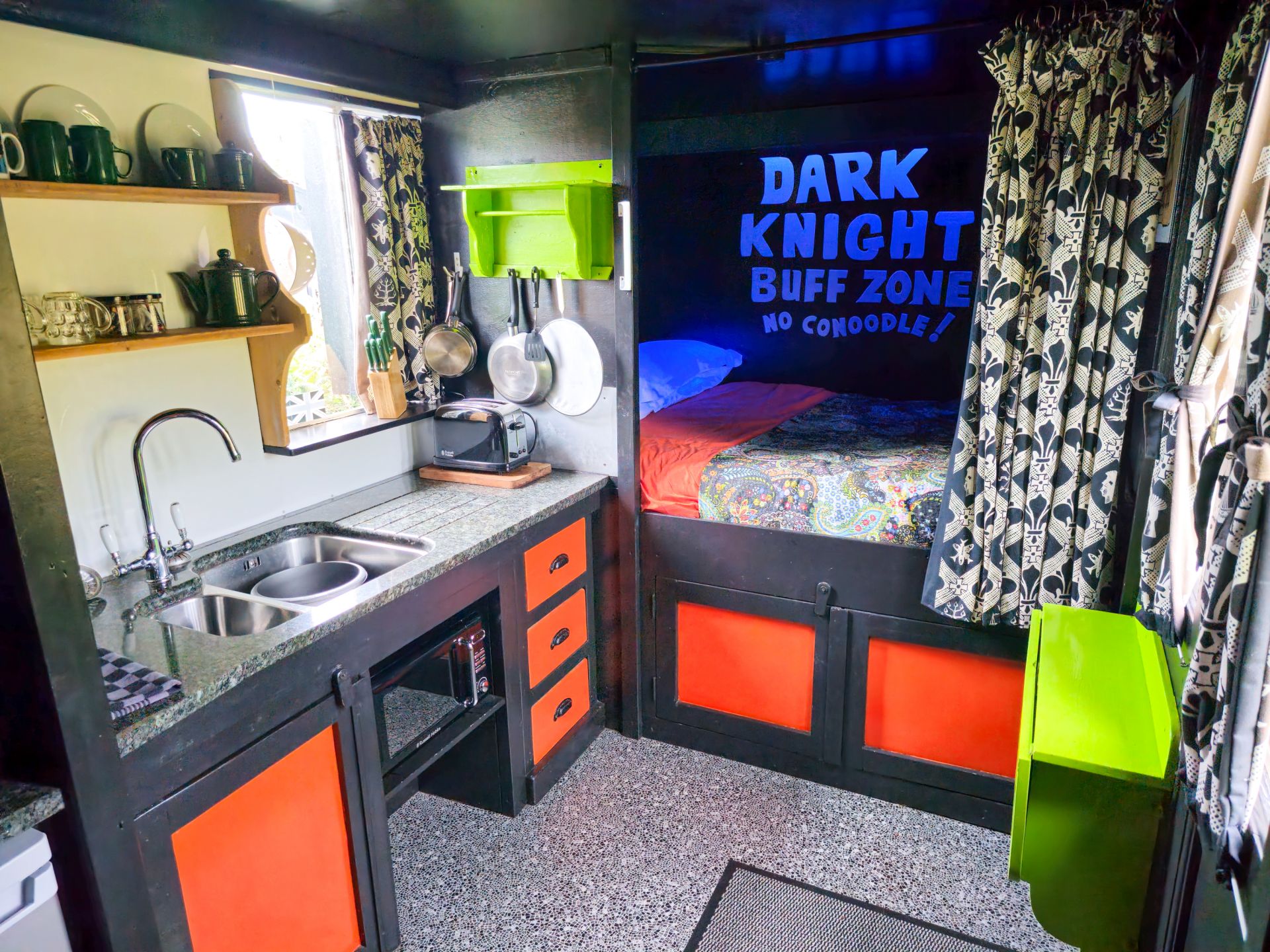 Black and Orange with UV lighting! Double bed plus two small children's beds, dining area, sink, combination oven/grill microwave, fridge, kettle, toaster.