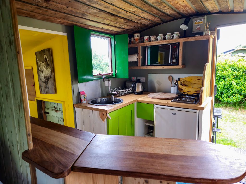Veranda doors, wood burner, small fridge, kettle, toaster, gas hob, sink, brass double bed, two single beds. Your own outside victorian privvy!