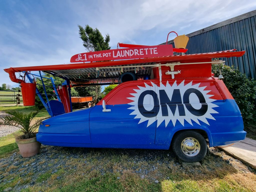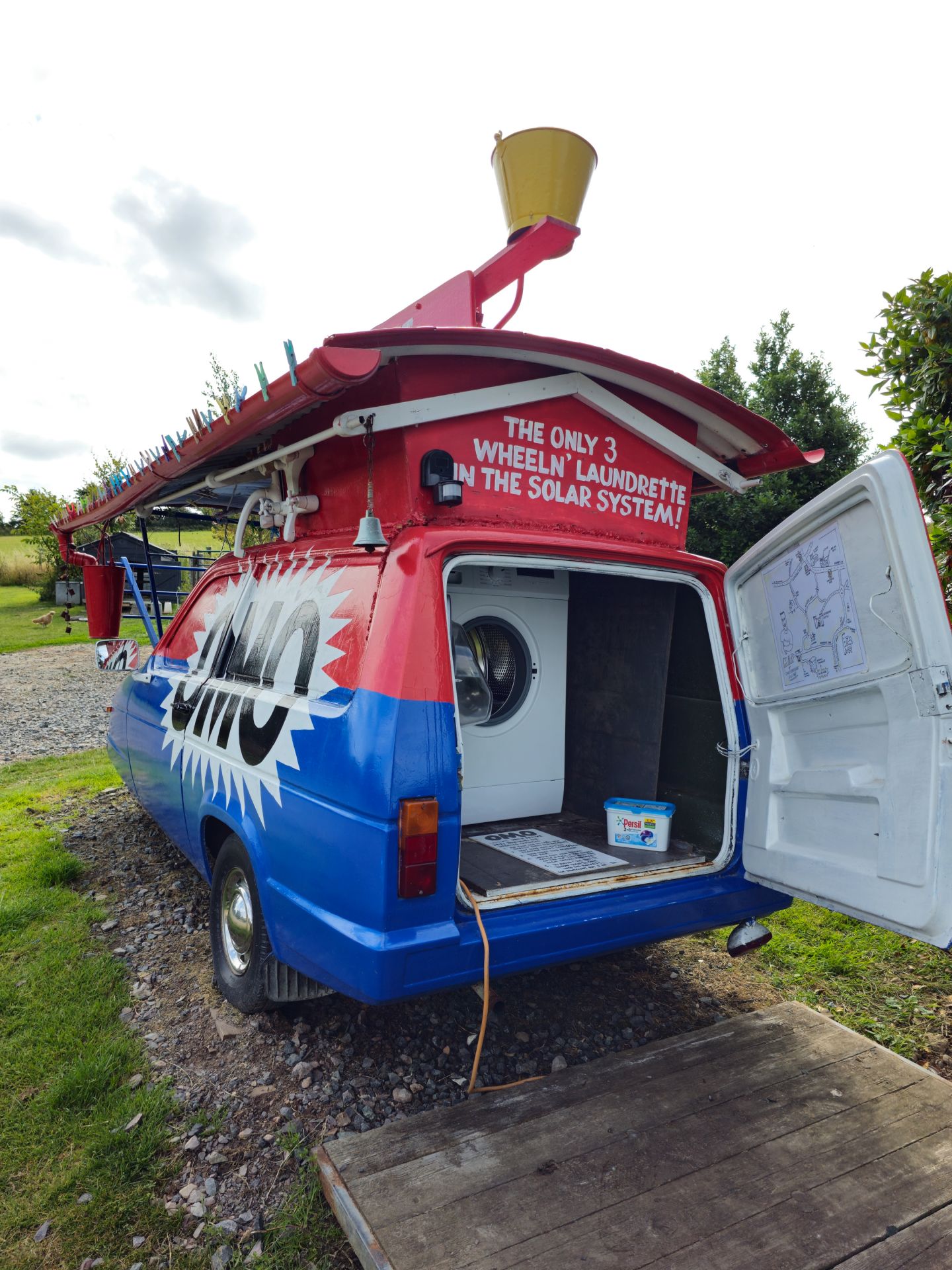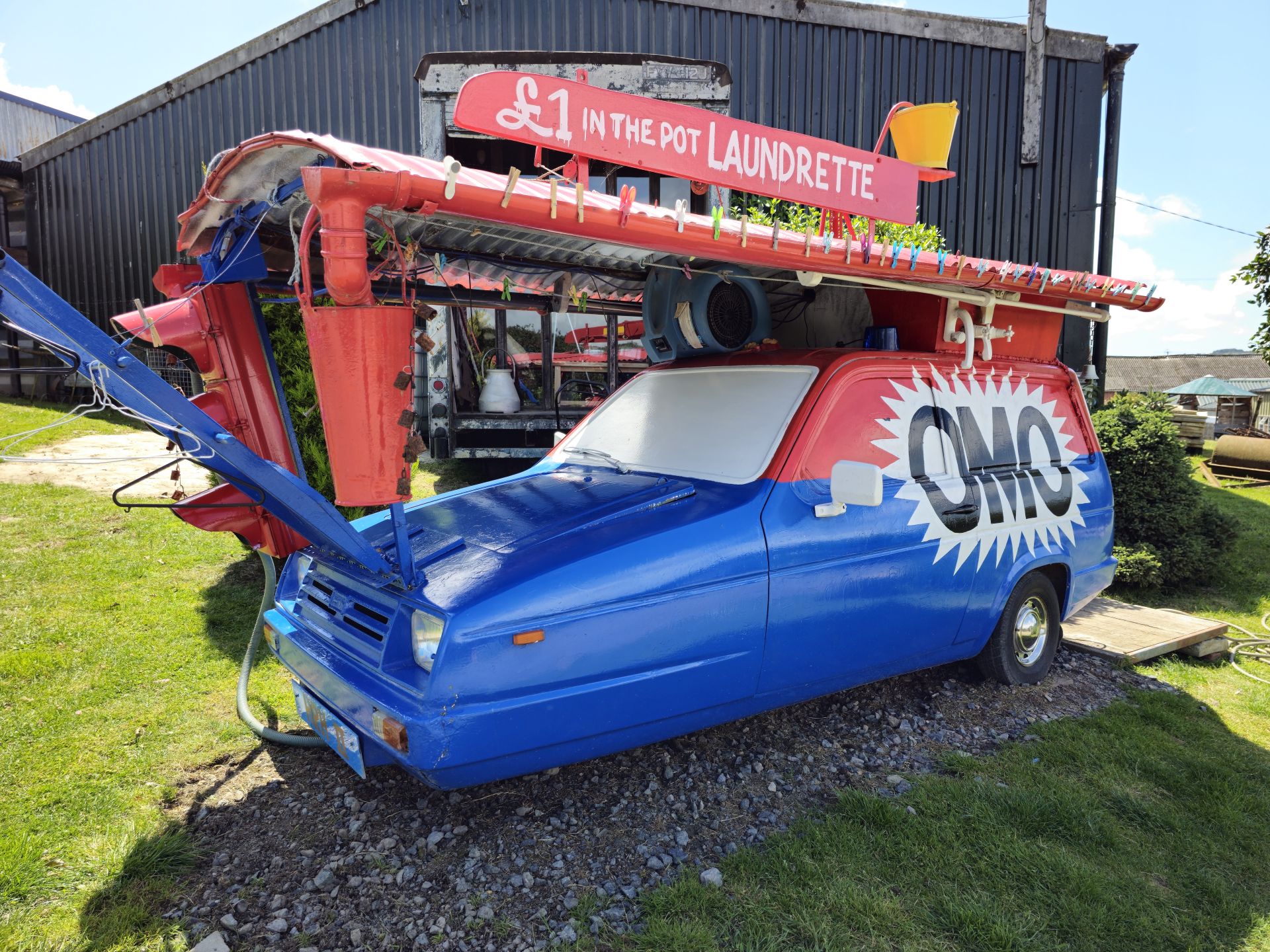 The world's coolest 3-wheeling laundrette converted out of a Reliant Robin makes washing those 'dirty undies' much more fun! It's a pound a throw!